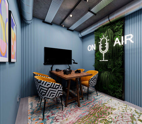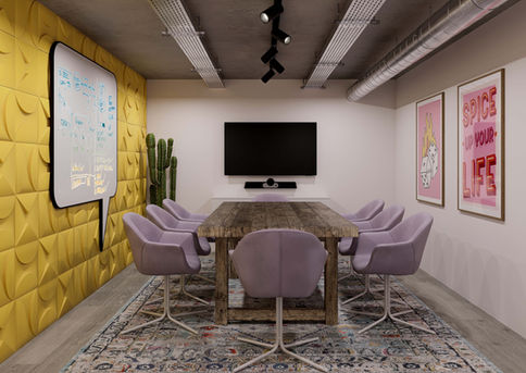 This 3D visualisation presents a contemporary co-working office designed to inspire productivity and collaboration. The space combines industrial elements like exposed ceilings and concrete floors with warm, natural wood textures and sleek, modern furnishings. Thoughtfully arranged workstations and vibrant design details create a welcoming environment ideal for creative professionals and teams.